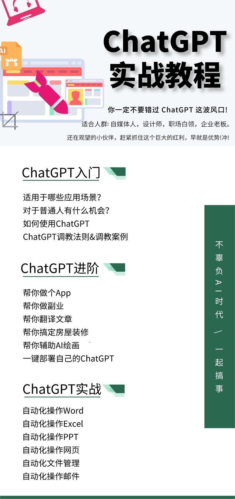 买教程立即送ChatGPT独立账号,无需等待,数量有限,先到先得。本教程带你从小白成为ChatGPT专家,10倍提升业务生产力。适合人群:自媒体人,设计师,职场白领,程序员,企业老板。你将能获得
