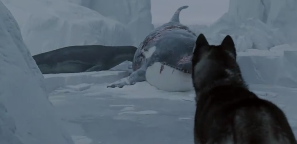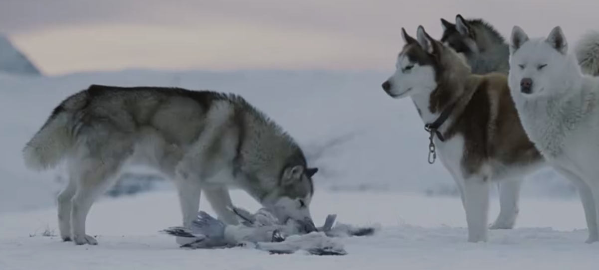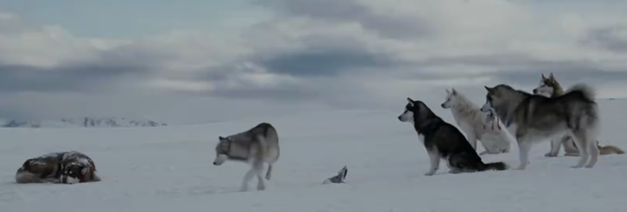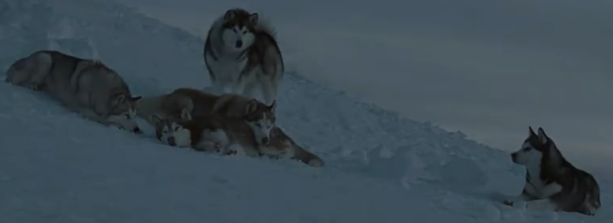 极光出现的时候,麦克斯没有听话,带的其它几只狗也一起跟着追极光,导致其中一条狗狗死了,别的狗狗去看死了的狗狗,它都不敢靠近,最后其它的都走了,它才靠近,那时做为人可能有人会想到要不要吃掉死去的?那样就错了,狗狗是不会的,麦克斯只是深深的自责。但是很奇怪,怎么那么容易就摔死了!