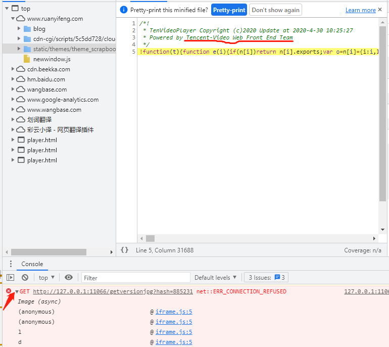 在浏览一个网页的时候,无意间在开发者工具控制台发现 get http://127.0.0.1:11066/getversionjpg?hash=885231 失败的输出,展开后发现是嵌入网页的腾讯视频播放器在访问,这是要和本地安装的客户端互动?