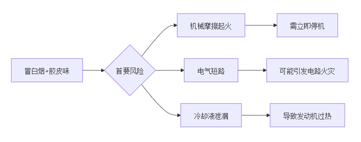 白烟伴随焦味是严重故障信号,继续行驶可能引发自燃!应迅速靠边熄火,撤离人员并放置警示牌。初步检查(需在冷却后操作)