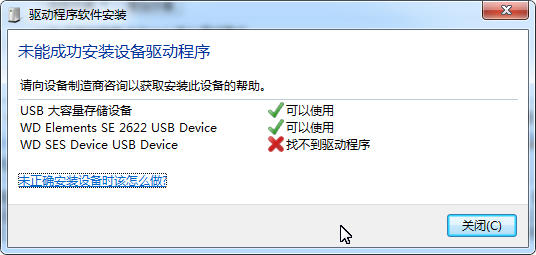 最近买了一个西部数据(WD)2TB USB3.0移动硬盘Elements SE 新元素系列2.5英寸,但是使用的时候遇到一点问题。刚插到电脑(Windows7)上的时候可能是因为Shell Hardware Detection服务没有启动,所以一直没反应,过了几十秒才弹出一个提示Unknown Device,以为是USB口的问题,换了一个蓝色的USB口,结果插上没有任何反应。又换回之前的接口,Shell Hardware Detection 服务也启动了,这次有反应了,开始安装驱动,但是有一个驱动安装失败,找不到驱动程序。虽然现在移动硬盘已经可以读取了,但是不应该在移动硬盘中附带驱动的吗?