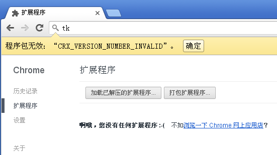 虽然网页可以打开了,但是离线安装扩展的时候仍然提示:程序包无效:“CRX_VERSION_NUMBER_INVALID”,看来是新版本的浏览器对 CRX_VERSION_NUMBER 这一项有了新的标准,不再兼容以前的了。
