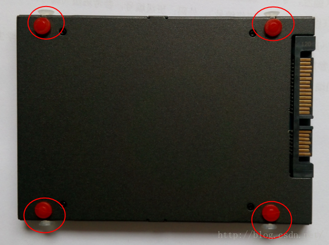 9、将硬盘托架带的红色的软钉压入SSD固态硬盘的前面孔中,将白色的塑料螺丝拧入侧边的螺丝孔