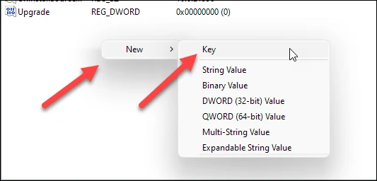然后,右键单击右面板上的任何空白区域,选择“新建”,然后是“键”选项。