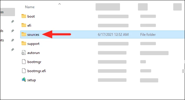 现在,将可启动的 Windows 10 USB 驱动器插入您的计算机,并在文件资源管理器中打开它。然后,打开 Windows 10 USB 驱动器中的‘ sources’文件夹。