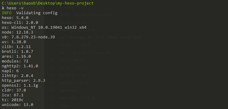 首先打开命令行,输入 npm install -g hexo-cli 安装 Hexo-Cli,以便之后可以在命令行直接使用 Hexo;完成之后在命令行输入 hexo -v 查看安装情况,如下图。