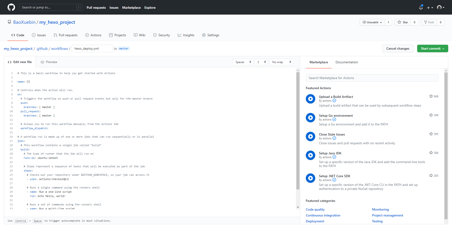 让我们回到 Github 的仓库首页,找到 Actions,点击 set up a workflow yourself,进入 workflow 的编辑页面,如下图: