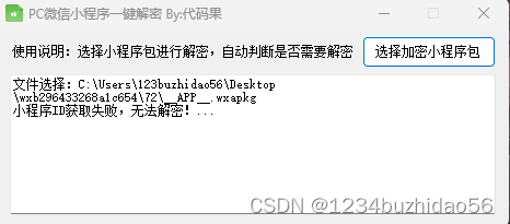 1、首先解包,用UnpackMiniApp.exe进行解密,报错:小程序ID获取失败,无法解密。 解决方法:用的另外一个大佬的解密工具(听说只有电脑的有加密,手机的没有,如果加密失败,可以尝试才模拟