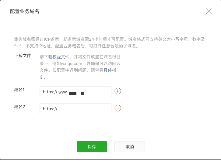 请下载校验文件,并将文件放置在域名根目录下,例如wx.qq.com,并确保可以访问该文件。如配置中遇到问题,请查看具体指引。