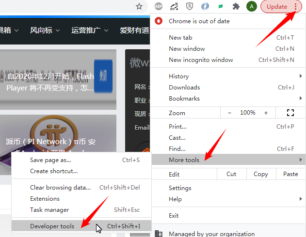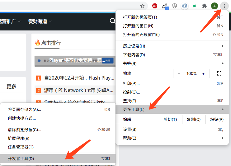 得到视频网站中的 .m3u8 文件的方式就是通过浏览器的开发者工具,推荐使用 Chrome 浏览器,你可以使用Firefox、IE,只要你用的够溜,通常Windows下调出浏览器的开发者工具的快捷键是 F12,Mac下是 command(⌘)+option(⌥)(Alt)+i,你也可以通过菜单调用,如下图: