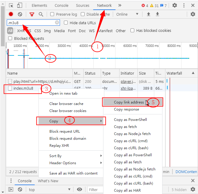 在 index.m3u8 文件那一行单击鼠标右键》copy复制》Copy Link Address 复制链接地址